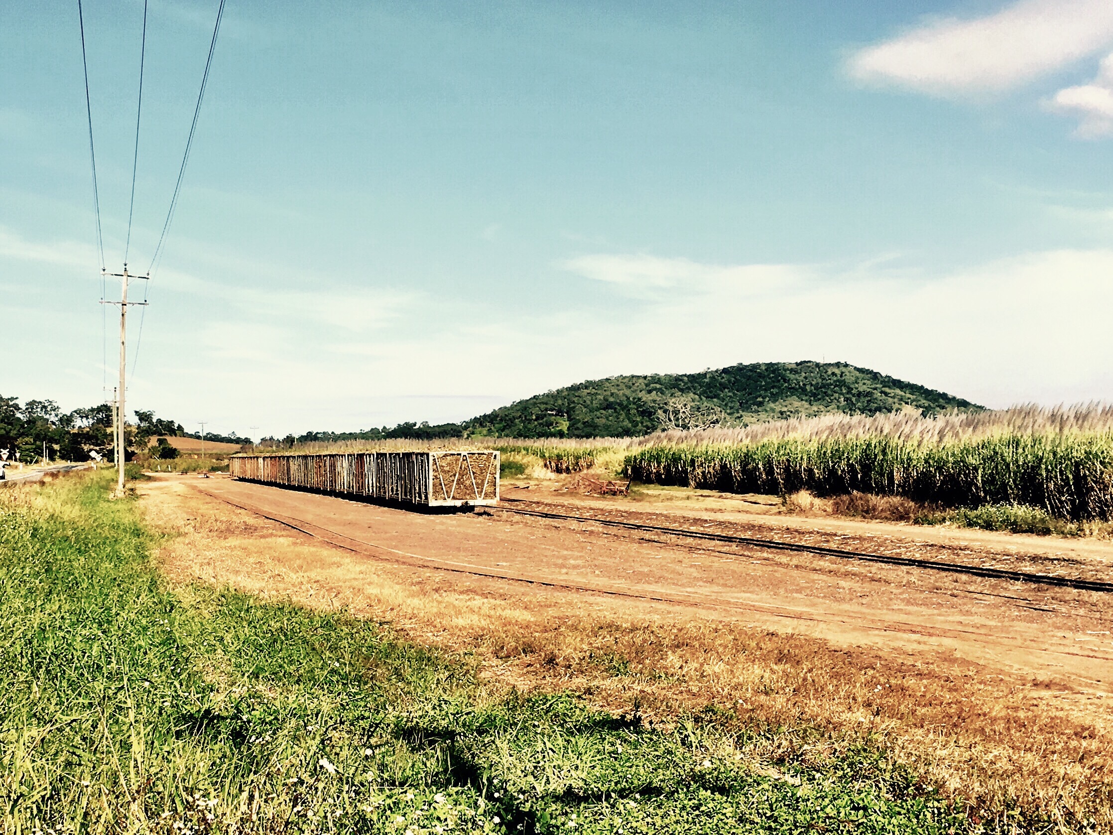 This next photo is my favourite. It’s an iPhone photo of sugar cane bins, lined up and waiting for the locomotive to come and take them to the sugar mill. I remember, as a kid, going with my dad to the siding (that’s what this is called) to check the bins. Each bin has a ticket in a slot to identify who owns the cane in that bin. The farmer gets paid based on the weight of cane and the sugar content in the juice once it’s crushed.
