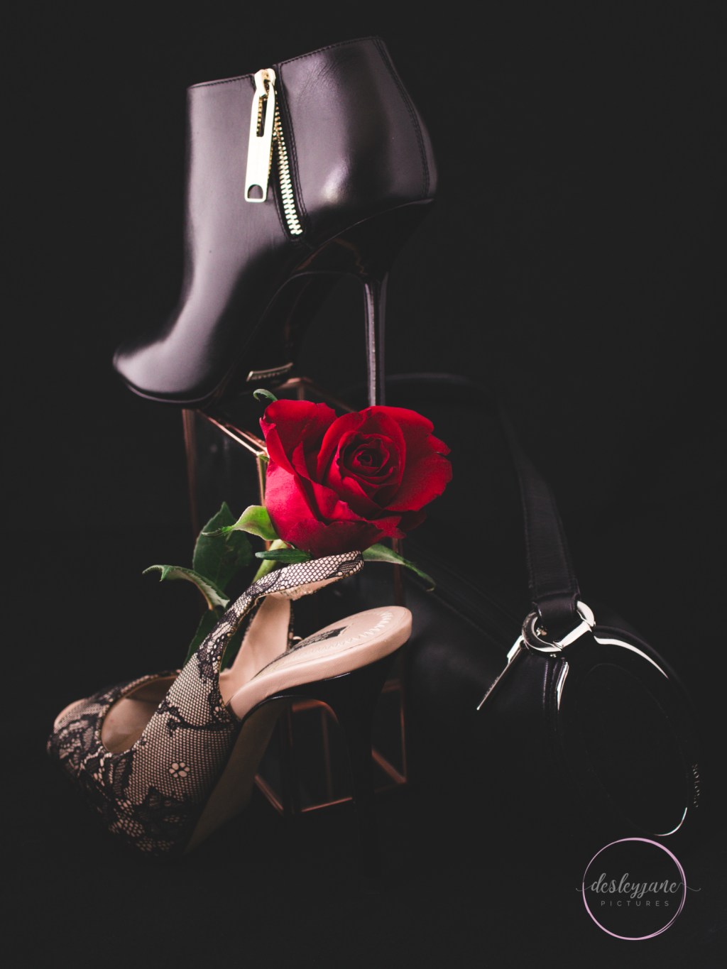 The brief was to create a photograph using some of her favourite shoes and handbags to make into an anniversary card. He stealthily removed the shoes (singles) from their boxes as well as a handbag and dropped them off at my place on a Friday morning.